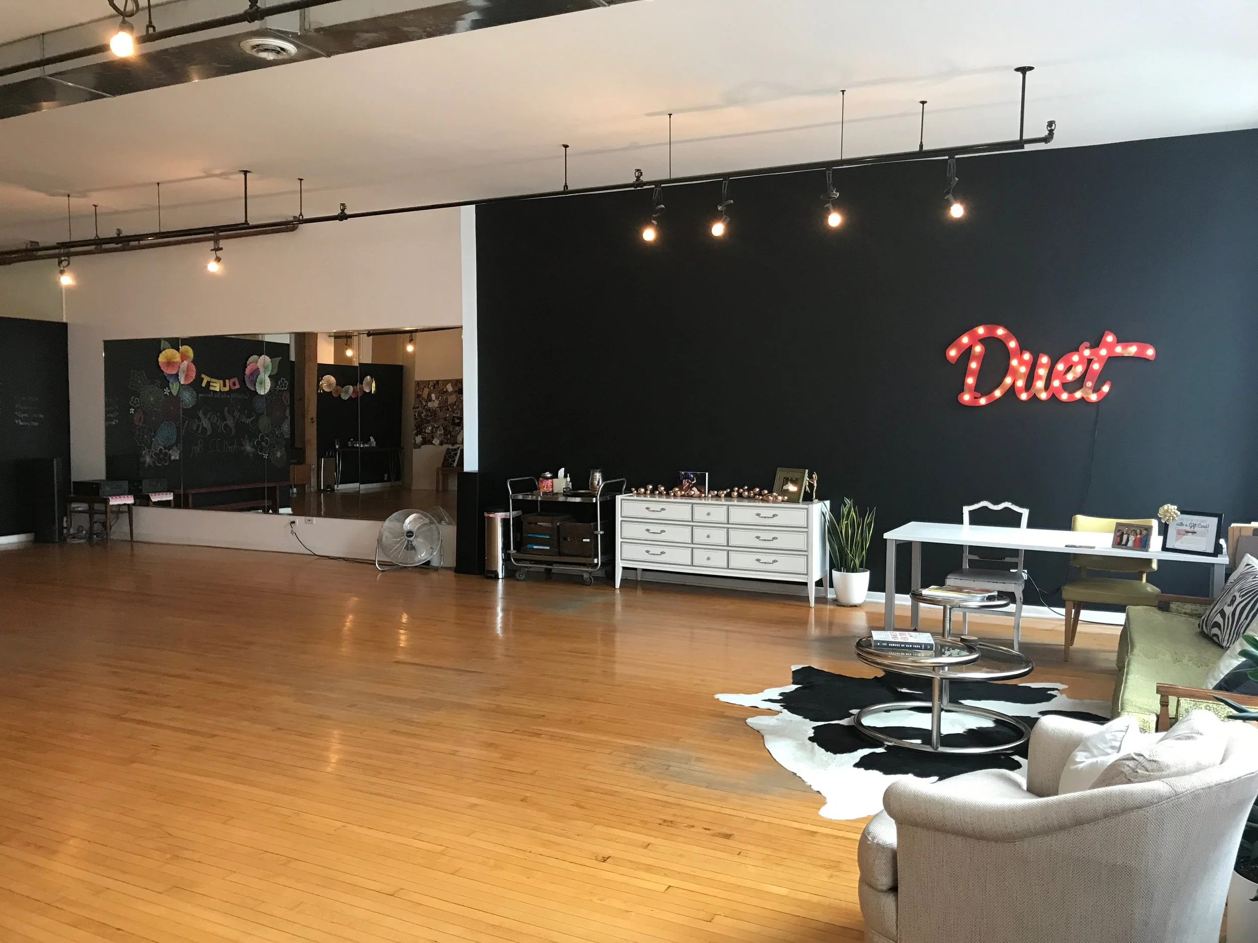Duet Dance Studio is a boutique dance studio located in West Bucktown. Our studio B is a beautiful, spacious studio with south facing windows that offer plenty of natural light throughout the day. It is ideal for photo shoots, video production and any fitness classes.